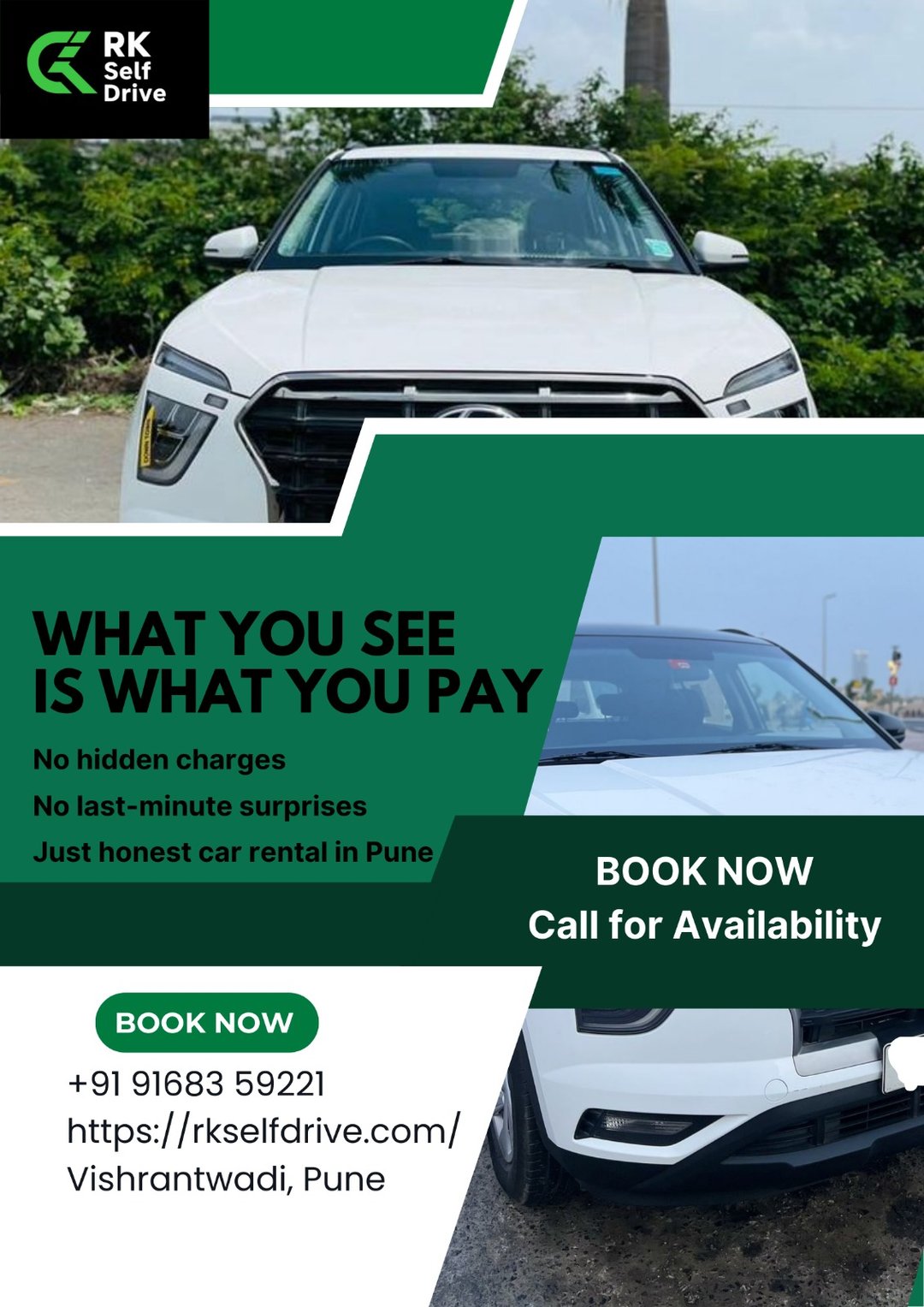 Rk Self Drive offers affordable and reliable self drive cars in Pune and flexible car rental in Pune for every occasion — daily commutes, weekend getaways, airport pickup & drop, or outstation trips. Choose from 5 seater hatchbacks, 7 seater self drive cars on rent in Pune, or spacious 8 seater SUVs for family and group travel. As a trusted car rental Pune service, we provide well-maintained vehicles, transparent pricing, and convenient pickup points across Viman Nagar, Vishrantwadi, Hinjewadi, Kharadi, and Pune Airport. Whether you search for rental cars in Pune, Pune car rental, or simply need to rent a car in Pune, Rk Self Drive ensures privacy, comfort, and a smooth booking experience.